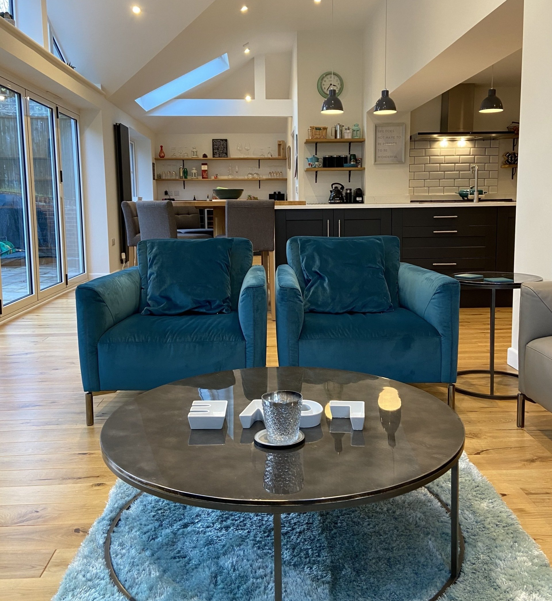 7. You can add elements that introduce more pops of colour and pattern in the living area and soft furnishings to make it cosier and create definition between kitchen/living. These should still coordinate with the rest of the space and be from the same colour palette. Textures and patterns should complement the rest of the interior and not be too obtrusive.